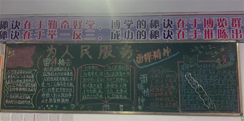 成才先成人,求知先修德。此次黑板报评比活动,加深了同学们对雷锋同志光辉一生的认识,更加深刻地体会到雷锋精神。希望我们的莘莘学子,以身边的“活雷锋”为榜样,从中汲取力量,自觉传承雷锋精神,争做美德少年。