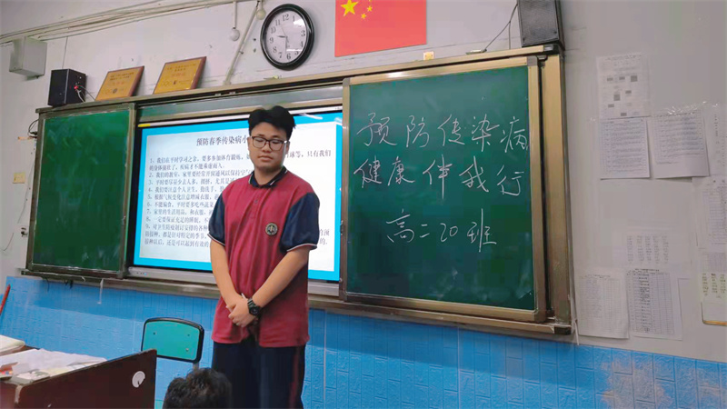 班会课上,班主任老师利用多媒体课件就常见传染病的特征、预防和控制等方面向同学们做了详细讲解,着重介绍了“流行性感冒、流行性腮腺炎、手足口病、水痘、麻疹、结核病”等常见传染病的症状、危害及如何预防等知识。