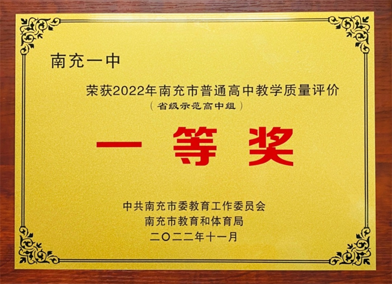 千淘万漉虽辛苦,吹尽狂沙始到金。我校在基础教育工作中不断取得重大突破和辉煌业绩。质量立校,人才强校,特色兴校!多年来,一中领导班子和教师团队高举质量大旗,砥砺奋进,大展宏图,不断刷新成绩,不断创造奇迹,以实力诠释卓越,以品质铸就辉煌。我校在南充市2022年基础教育工作高考综合成绩评价中荣获教学质量评价(省级示范高中组)一等奖,我校初中组和高中组均获“拔尖创新人才培养先进集体”光荣称号。