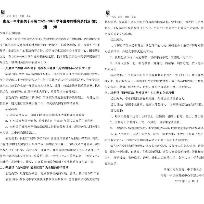 冬有冬的神奇,雪有雪的美妙,同学们也有他们的快乐,那就是——放寒假!寒假是学校生活的延续,是一堂生动多彩的实践课。为了让同学们的寒假过得“有趣”又“有料”,南充一中(本部)精心策划了一系列寒假德育实践活动。现在,寒假已过,我们一起来看看大家的表现吧!