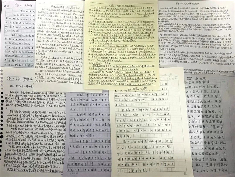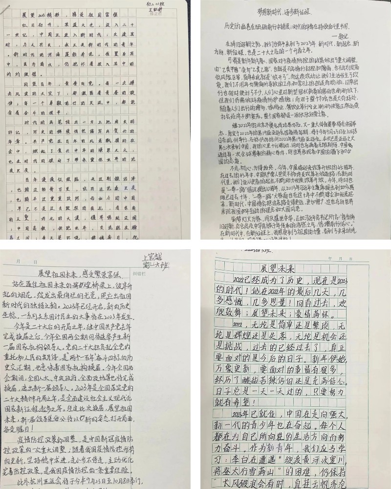 2023,我们憧憬着,我们感受着,我们激情迸发着。新的一年,我们赞美高耸入云的理想,也尊重平实质朴的愿望;新的一年,我们仰慕“黄沙百战穿金甲,不破楼兰终不还”的家国情怀,也欣赏“天下兴亡,匹夫有责”的微言大义;新的一年,我们崇尚“奋斗创造奇迹”的斗志,也企盼“顺遂无虞、皆得所愿”的实现......对于2003,关于祖国,同学们有太多的心里话要述说。据此,南充一中(本部)在寒假开展了“展望2023精彩 感受祖国富强”征文活动。在征文中,同学们用真挚的语言,分享了自己对2023年的期望和对祖国的热爱。希望通过此次活动,能让真善美的情愫在文字中永恒,能将所有美好的希冀都化作闪耀的繁星,照亮一中本部,更照亮孩子的心灵和未来。