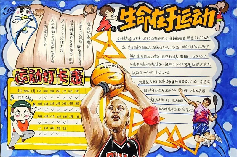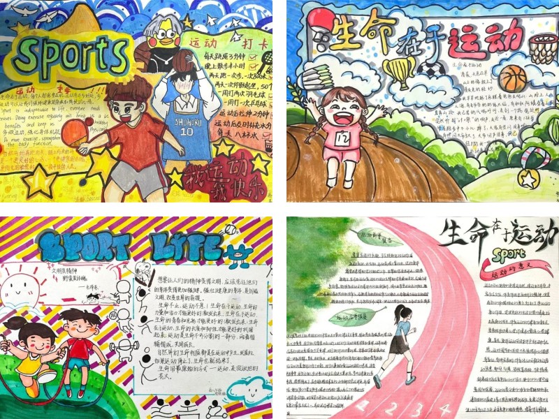 此外,同学们还精心设计、细心绘制了一张张精美的运动主题手抄报。这些作品色彩鲜艳、富有创意。让我们欣赏一下吧!