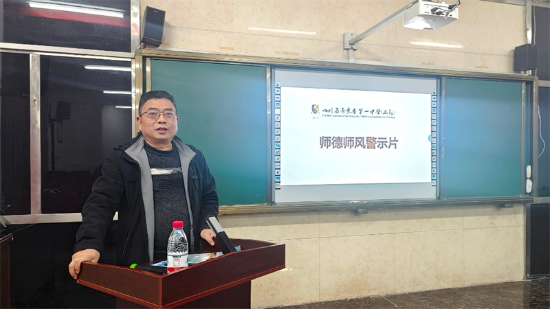 南充一中校长助理、本部纪检室主任李学林组织老师们观看师德师风警示片——《叩问师魂》