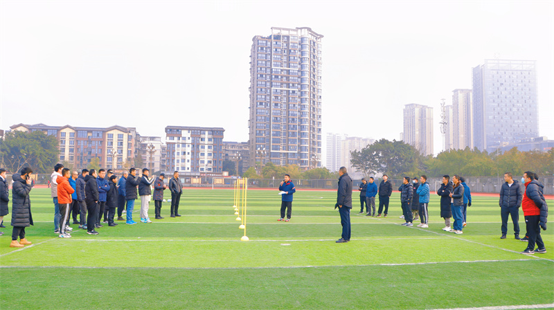 首先是南充市中小学体育黄爱明名师工作室成员,顺庆区体育兼职教研员高宜标老师在足球场进行了足球演示,讲解了如何绕杆运球及射门,强调了动作要求标准以及得分要求,在考试过程中应该注意的事项和违规行为,以及日常训练的方法,最后顺庆区体育教师进行现场操作练习。