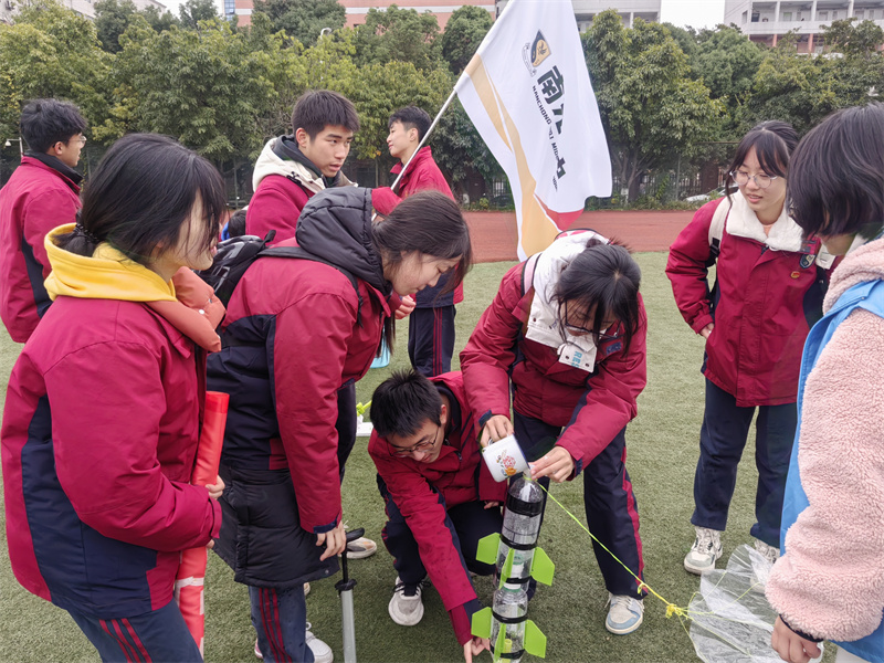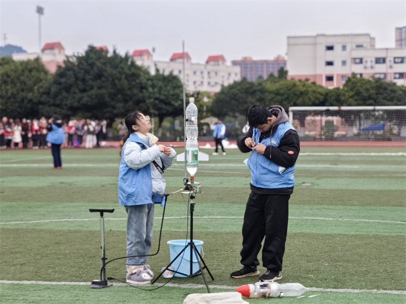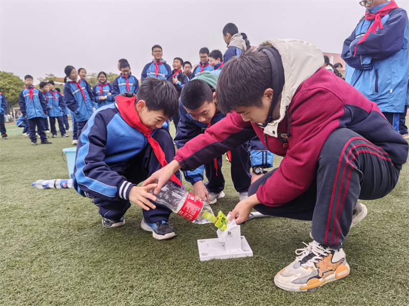 同学们在志愿者的指导下,纷纷动手体验水火箭发射。一次次水火箭的发射,体现了同学们对科学的探索与向往。