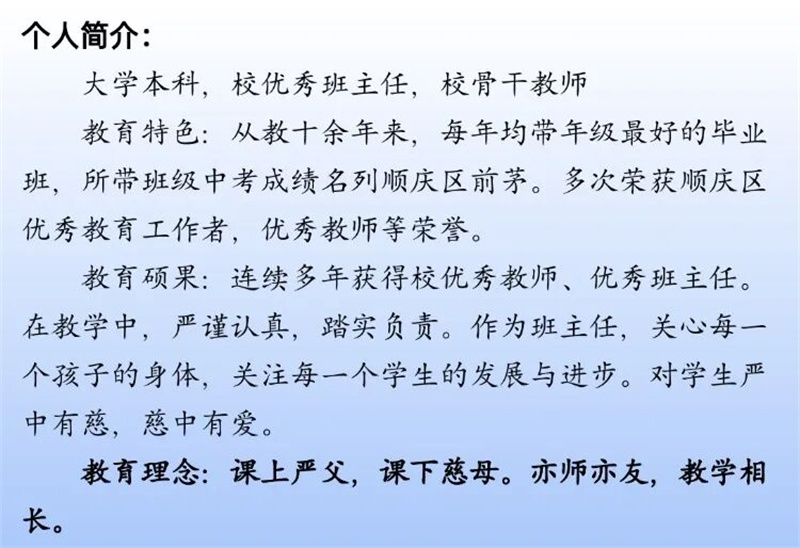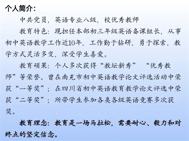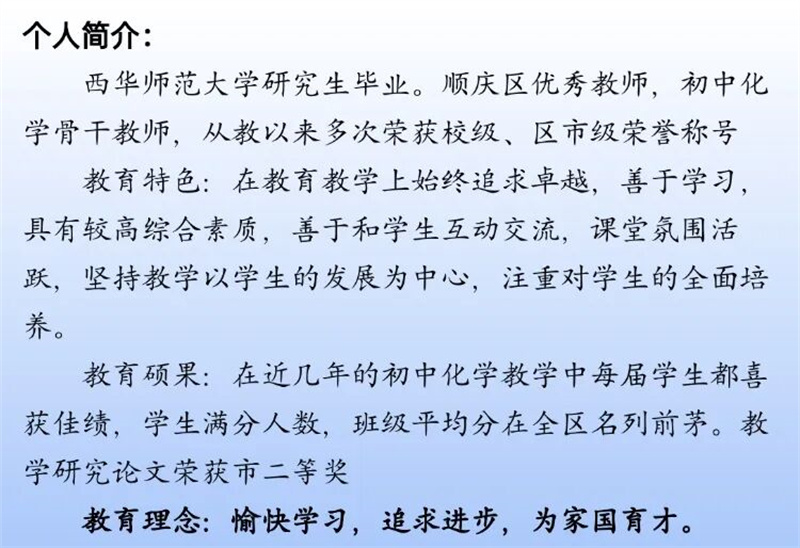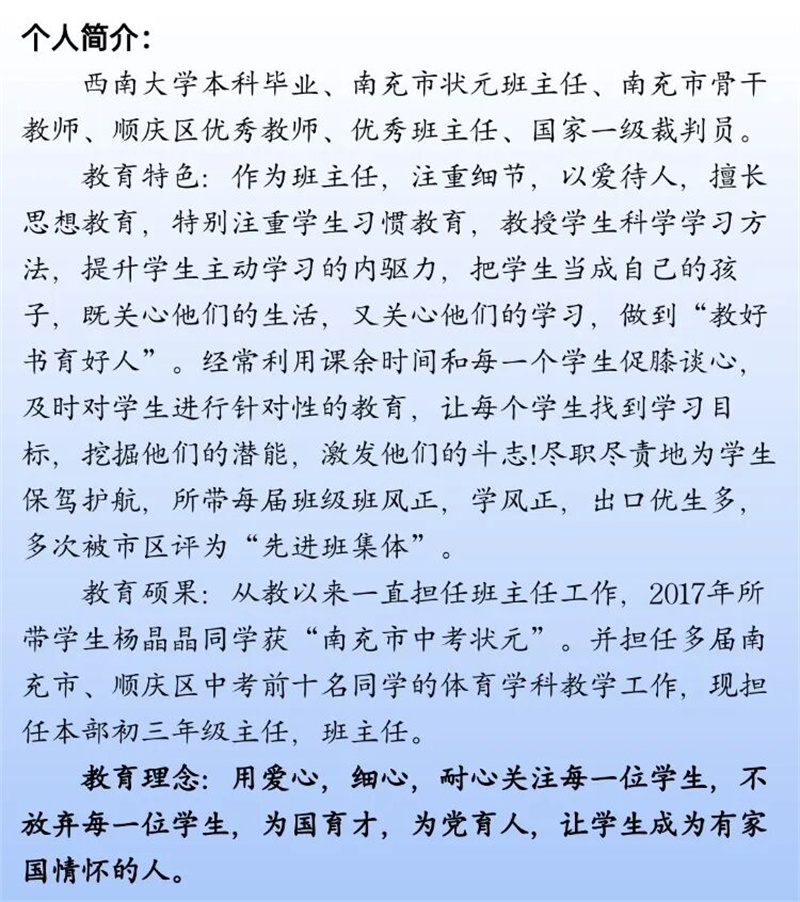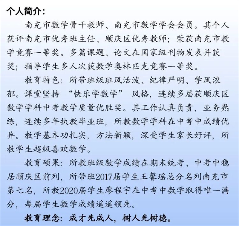 2017年中考,杨晶晶获得南充市中考状元,5人跻身顺庆前10名,37人进入顺庆前100名;2020年中考,1人跻身顺庆区前10名,38人进入顺庆前100名;2023年中考,4人斩获顺庆前10名,41人进入顺庆前100名。