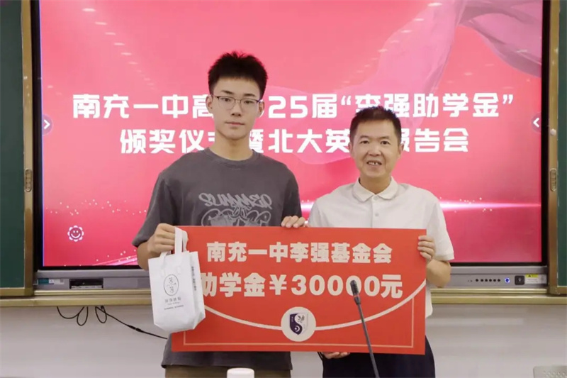 8月17日上午,南充一中“高 2025届‘李强助学基金’颁奖仪式暨北大英才报告会”启幕,向优秀毕业生代表段海林颁发荣誉,在盛夏时光镌刻一中荣耀。段海林以2025年高考688分佳绩,被北京大学临床医学专业录取,即将开启本博连读8年的学海之旅。段海林同学的卓越之路,闪耀着个人智慧与勤奋的光芒,更浸润着基金托举梦想的温暖力量,印证了道鑫教育集团在教育公平与质量提升道路上的坚实步履。