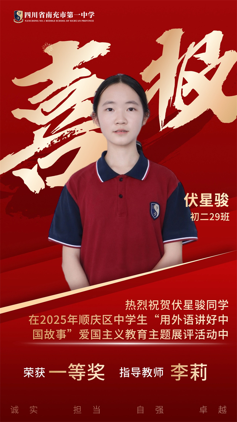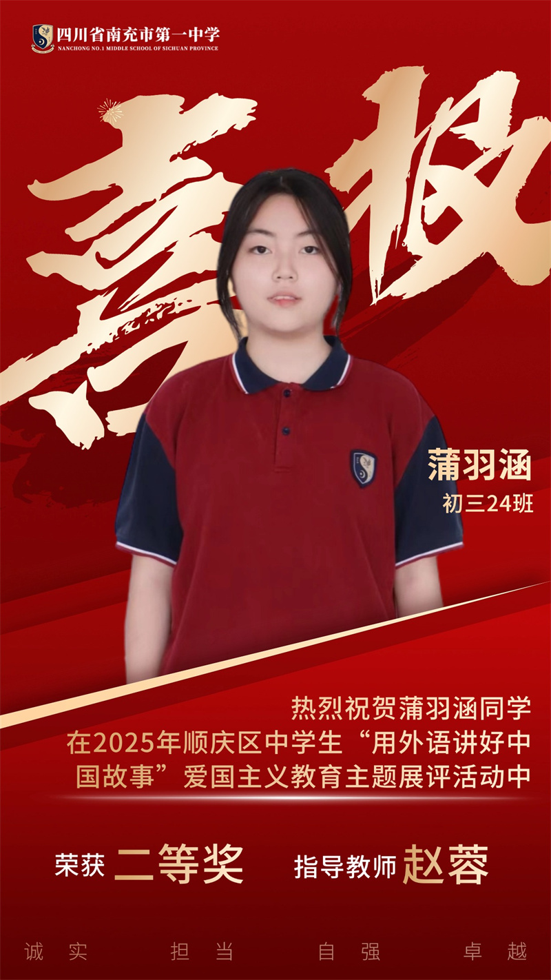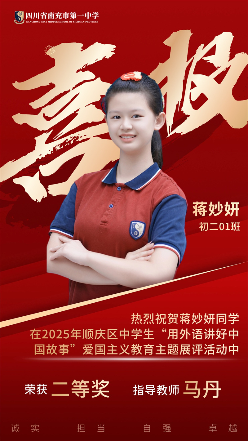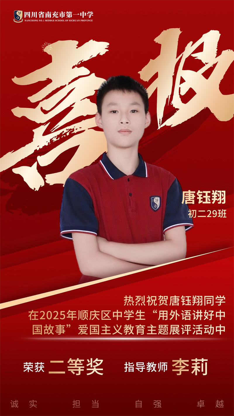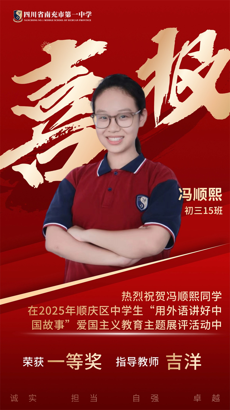 为贯彻落实党中央、国务院发布的关于《新时代爱国主义教育实践纲要》的相关文件精神,南充市顺庆区教育科学研究室开展2025年顺庆区中学生"用外语讲好中国故事”爱国主义主题展评活动。南充一中全体初中英语老师积极组织学生参与本次活动,同学们个个精心准备,教师们全程悉心指导,反复打磨稿件和视频。最终,我校荣获一等奖4个、二等奖11个,特此祝贺各位同学。
