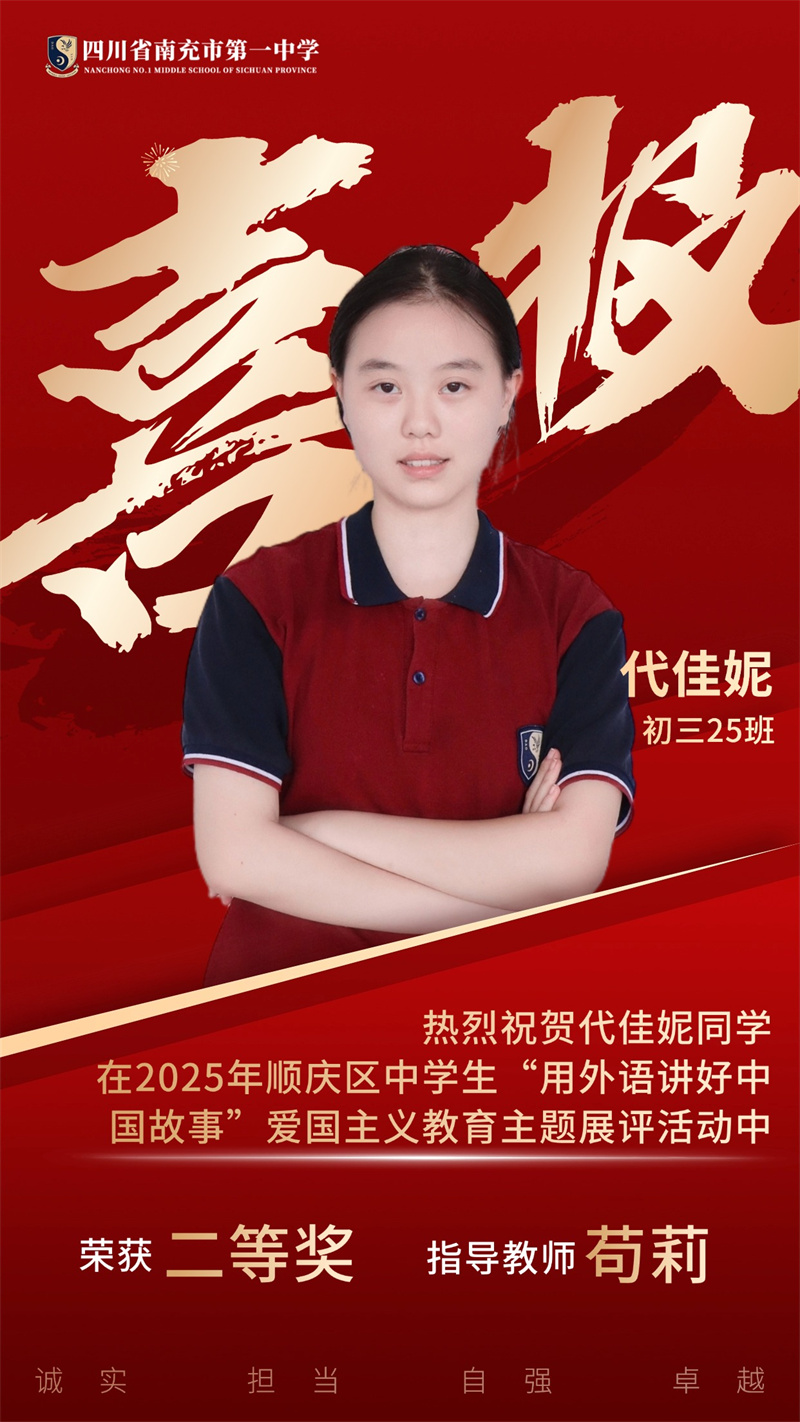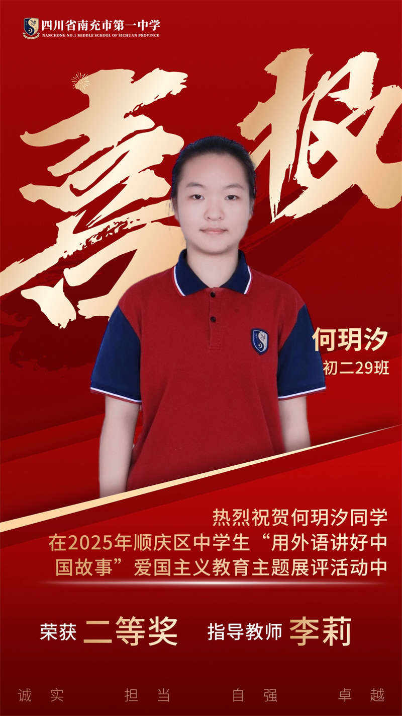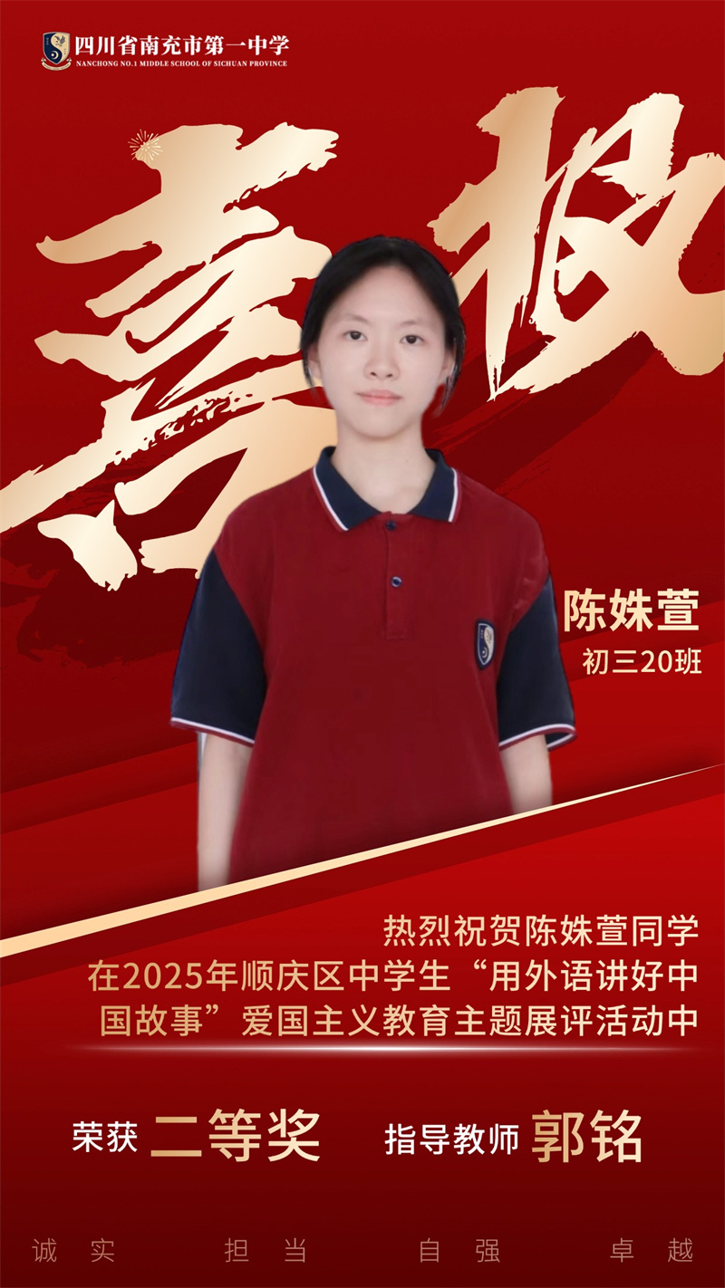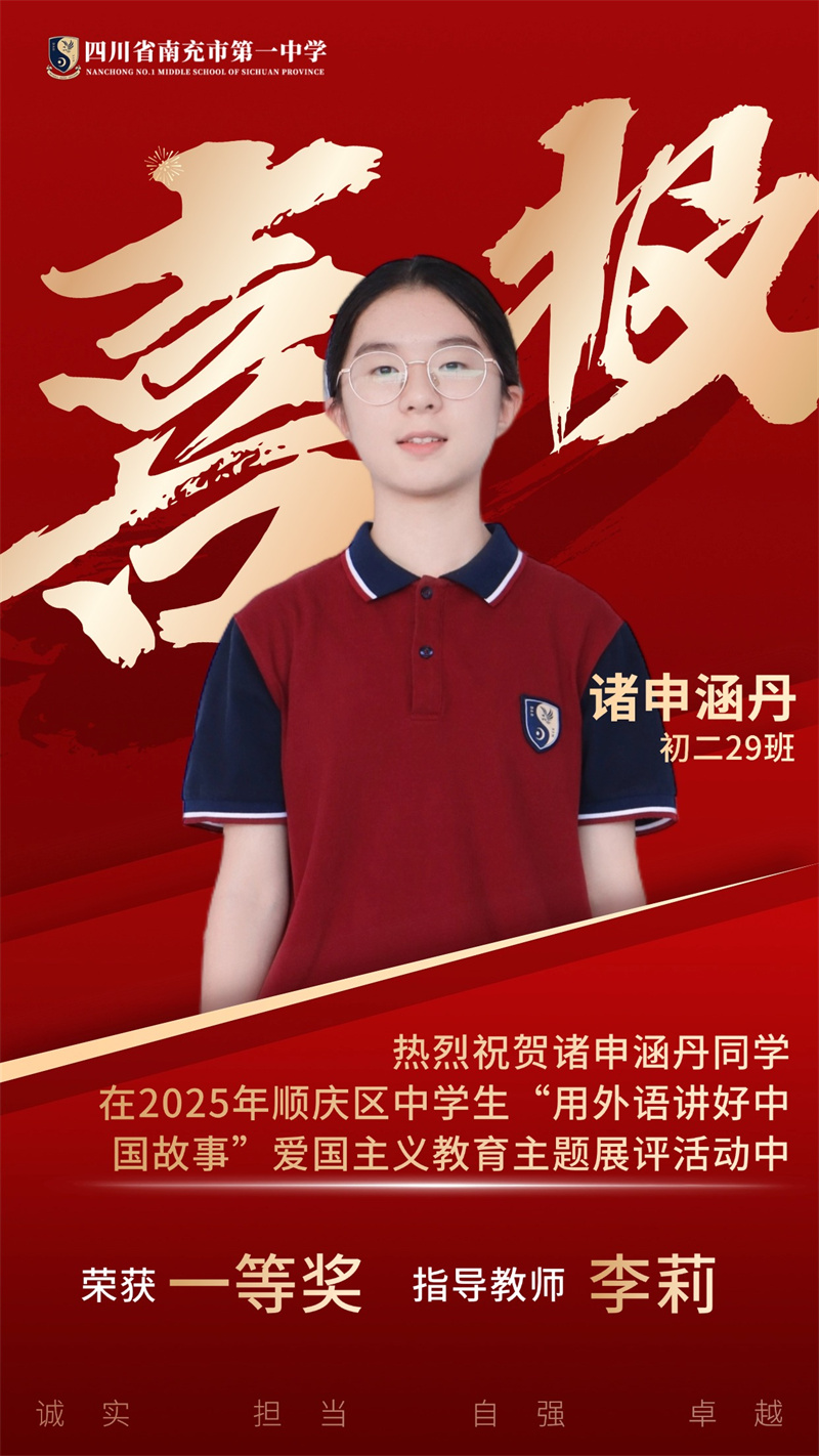 为贯彻落实党中央、国务院发布的关于《新时代爱国主义教育实践纲要》的相关文件精神,南充市顺庆区教育科学研究室开展2025年顺庆区中学生"用外语讲好中国故事”爱国主义主题展评活动。南充一中全体初中英语老师积极组织学生参与本次活动,同学们个个精心准备,教师们全程悉心指导,反复打磨稿件和视频。最终,我校荣获一等奖4个、二等奖11个,特此祝贺各位同学。