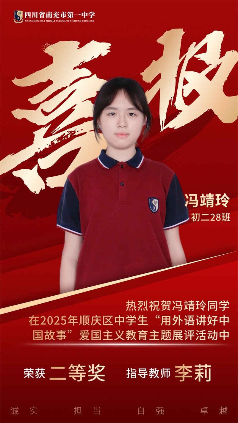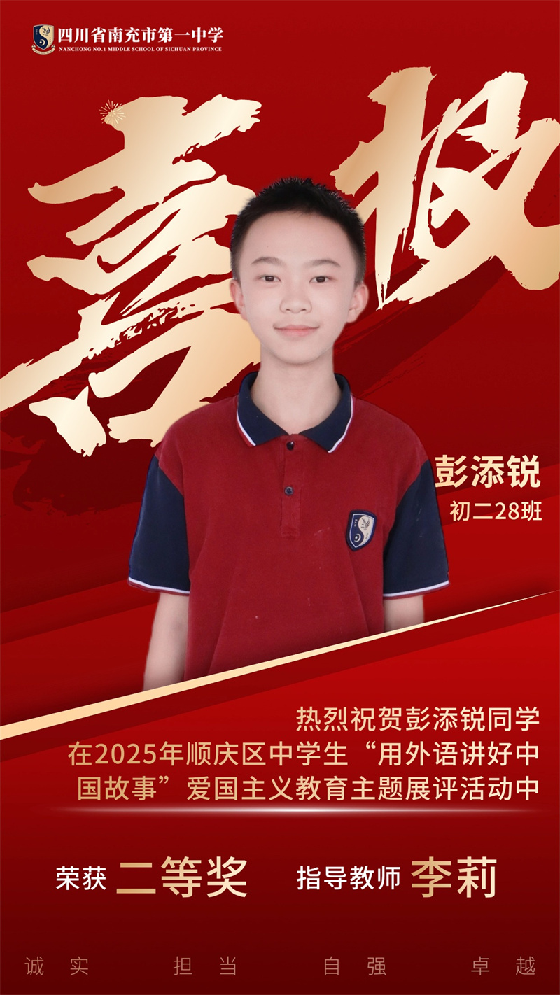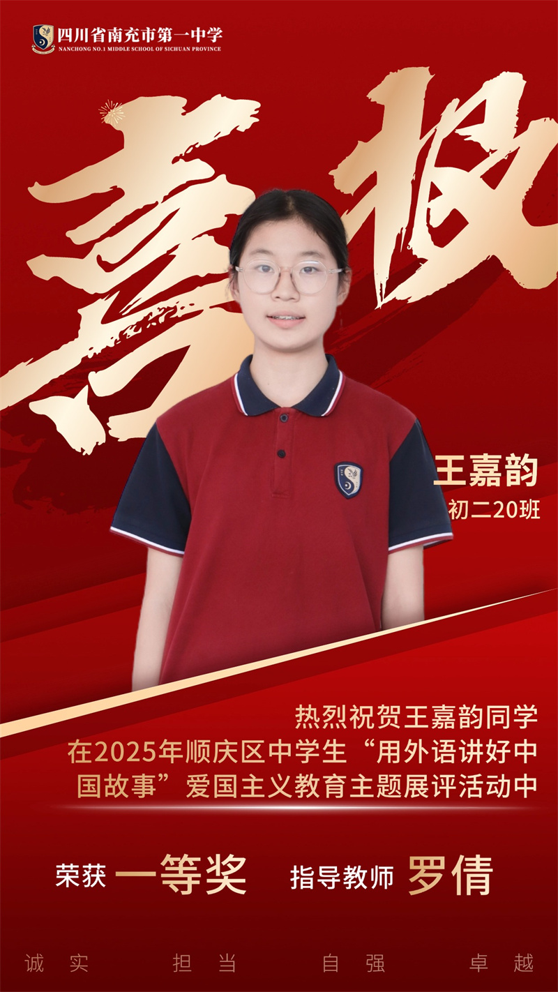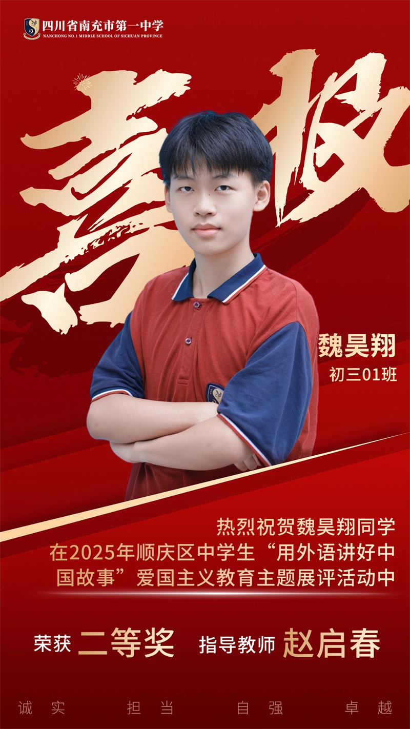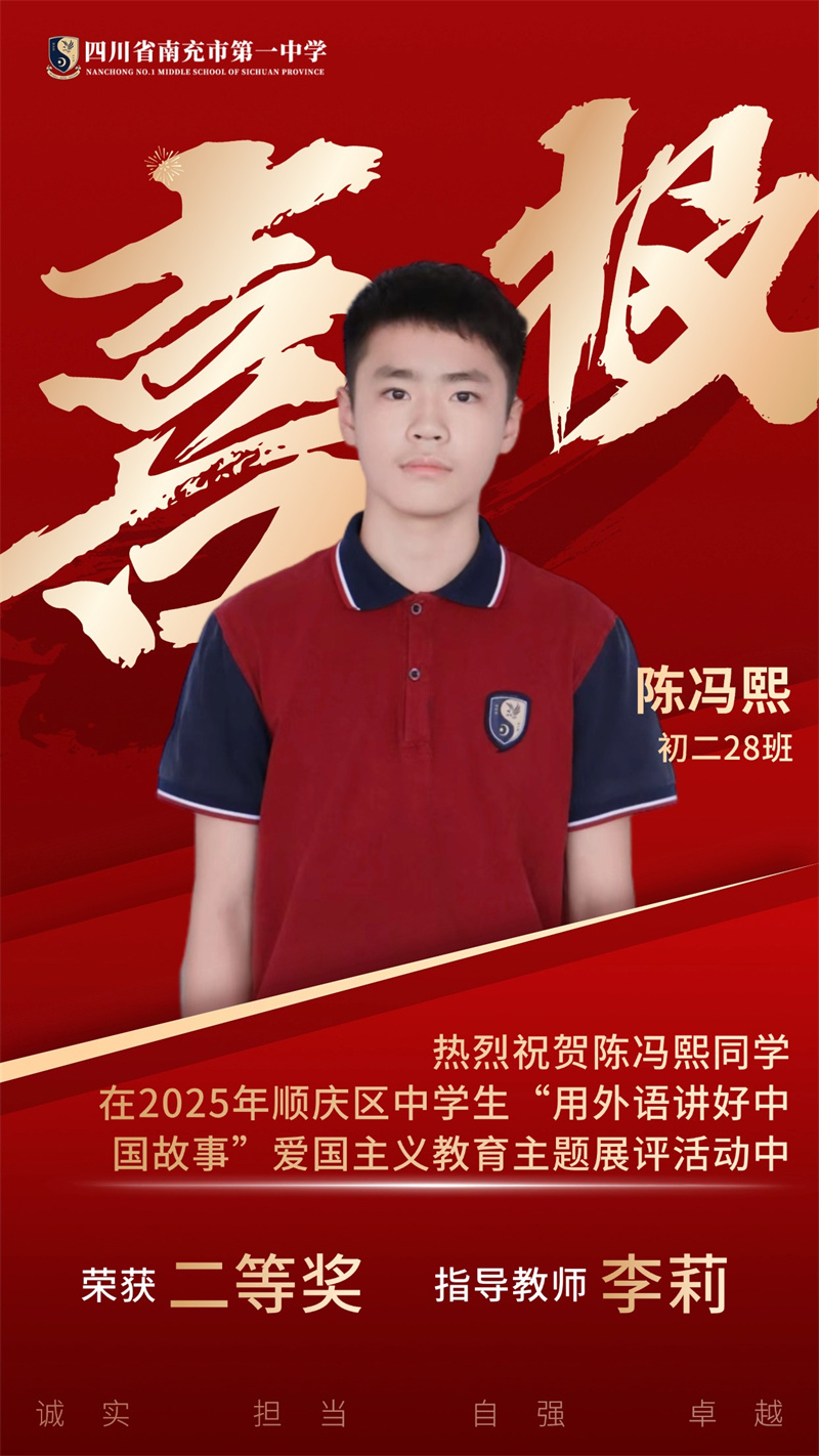 为贯彻落实党中央、国务院发布的关于《新时代爱国主义教育实践纲要》的相关文件精神,南充市顺庆区教育科学研究室开展2025年顺庆区中学生"用外语讲好中国故事”爱国主义主题展评活动。南充一中全体初中英语老师积极组织学生参与本次活动,同学们个个精心准备,教师们全程悉心指导,反复打磨稿件和视频。最终,我校荣获一等奖4个、二等奖11个,特此祝贺各位同学。