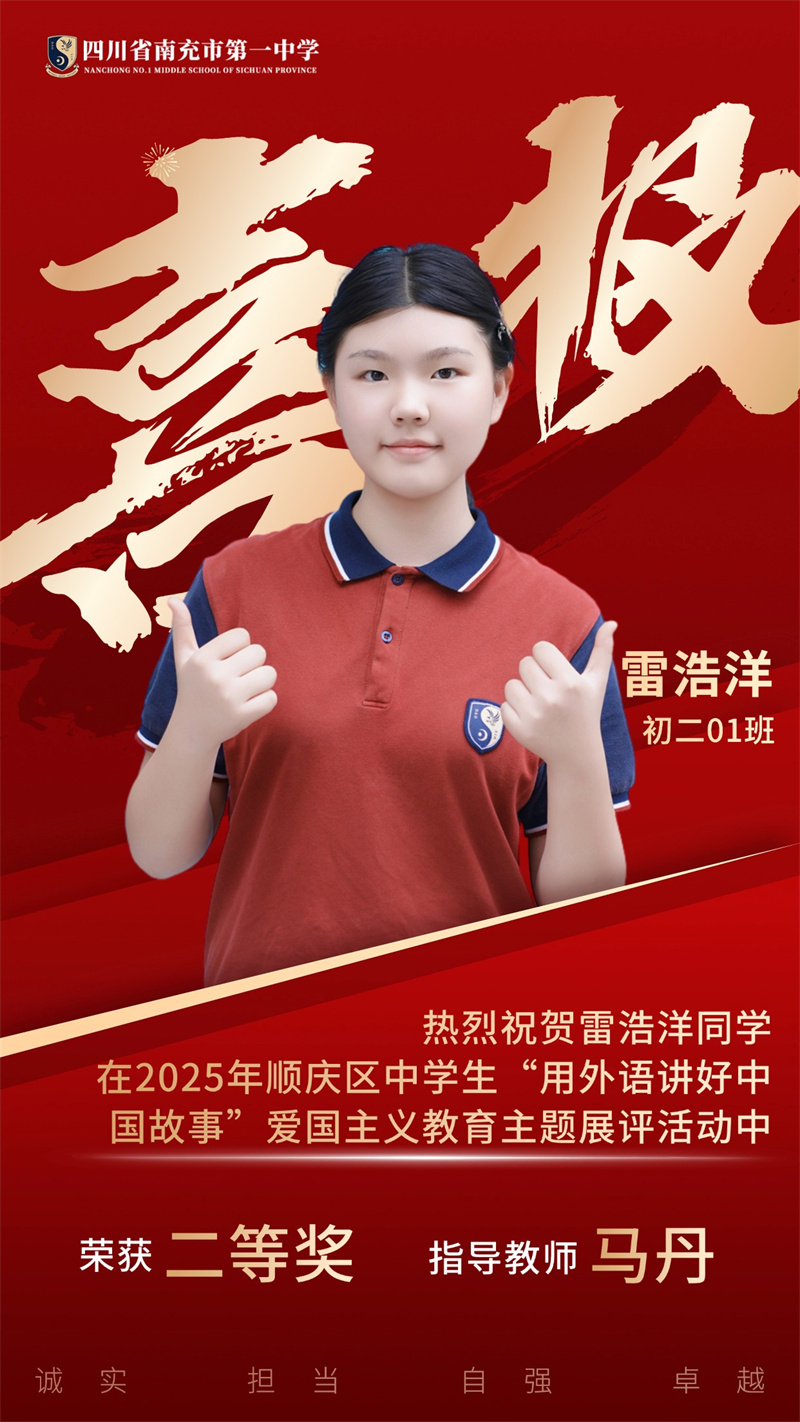 喜报!南充一中学子在2025年顺庆区中学生"用外语讲好中国故事”爱国主义主题展示活动中荣获一等奖4个、二等奖11个