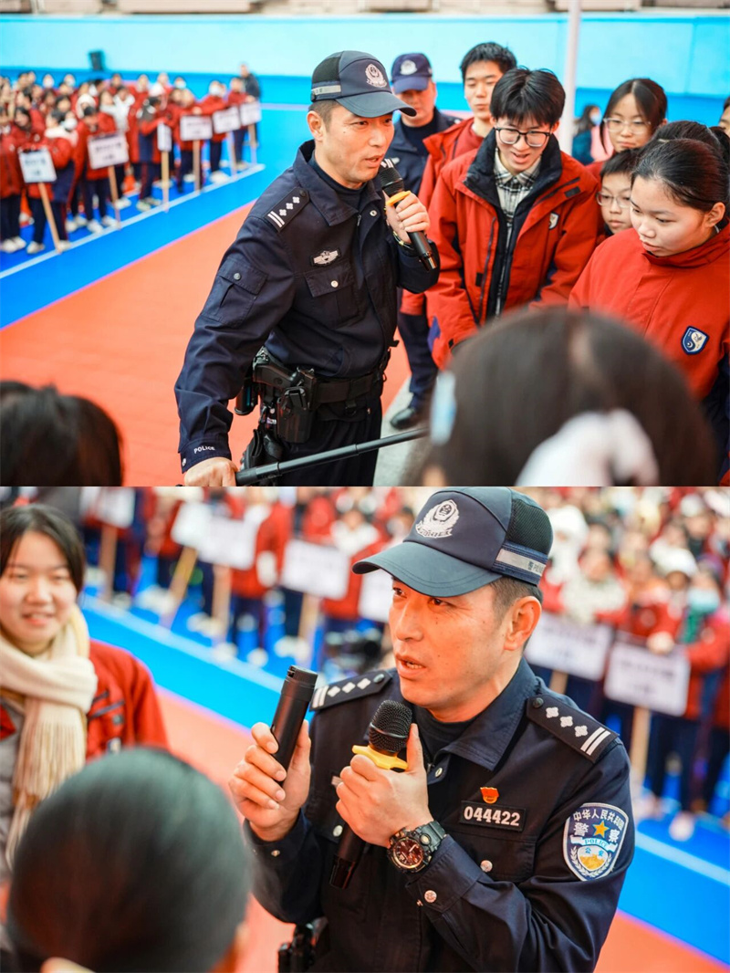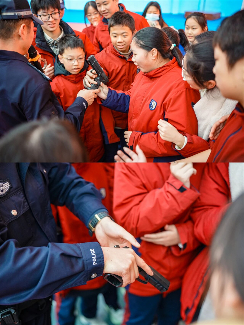 为让学生们更直观地了解警察的执法装备,江警官带来了部分常用警械进行展示与讲解。在严格的安全管理下,他向同学们介绍了辣椒水(催泪喷射器)的制伏作用、手铐的约束功能、甩棍的防卫与控制用途,并科普了警枪使用的严格法律程序与场合。江警官详细说明了这些装备的设计初衷是制止犯罪、保护人民,并严肃告诫同学们这些是法律赋予警察的特殊工具,普通人不得持有和使用。通过“零距离”接触与权威讲解,学生们不仅满足了好奇心,更深刻理解了法治的威严与警察叔叔为守护平安所承载的责任与担当。