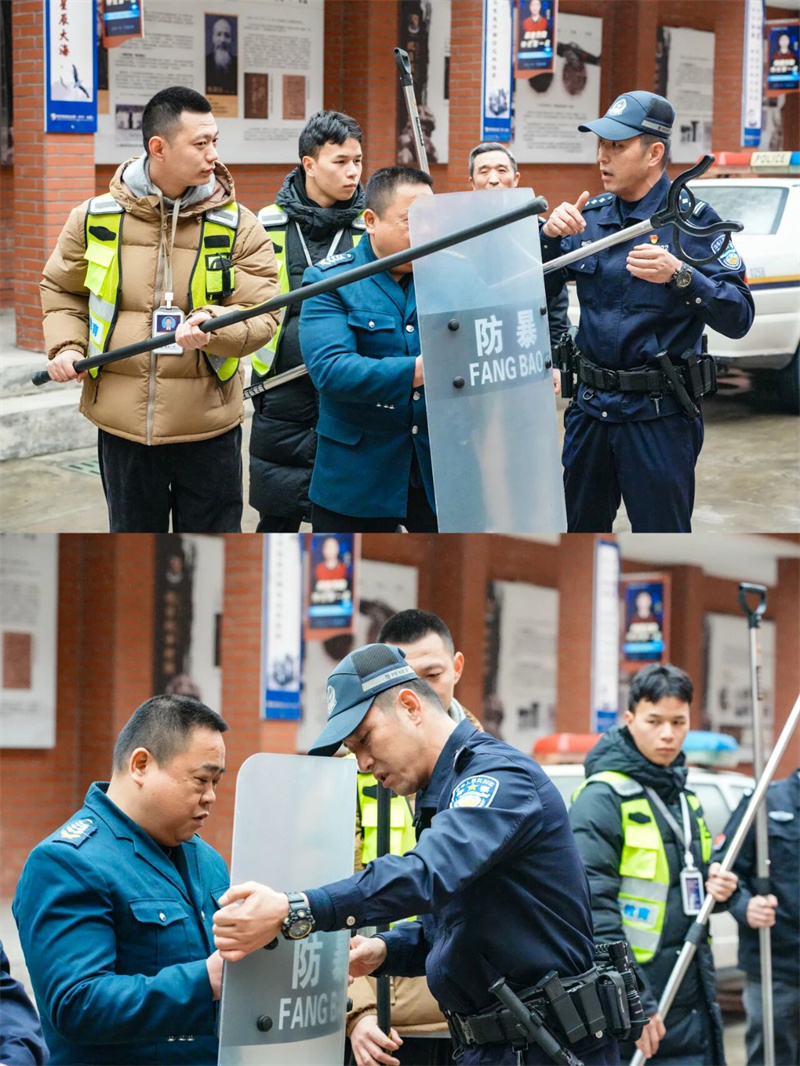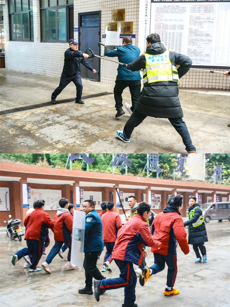 活动的最后环节,袁警官与江警官对我校全体安保人员及护校队教职工进行了专业的反恐防暴技能培训。两位警官首先分析了校园门岗、上下学重点时段的防范要点,随后现场示范并指导了防暴盾牌、防暴钢叉、长棍等专用器械的协同配合战术,模拟了针对持械“歹徒”入侵的应急处置流程。从人员站位、器械使用到控制带离,每一步都进行细致讲解和反复操练。通过此次实战化、专业化的培训,我校安保队伍的应急反应能力、协同作战能力和器械使用规范化水平得到了显著提升,为校园安全再添一道坚实的“人工屏障”。