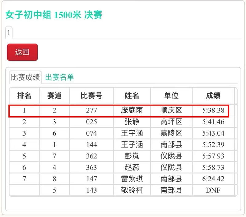 庞庭雨:1500米 第一名