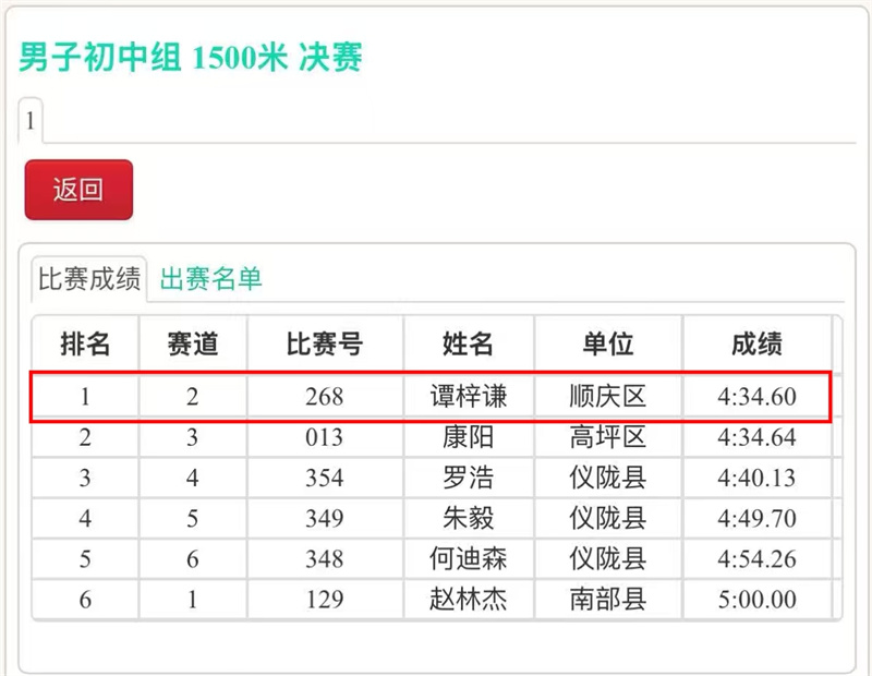 谭梓谦:1500米 第一名