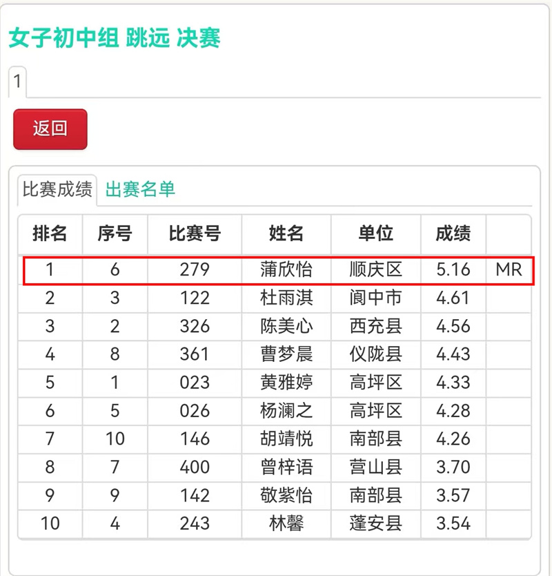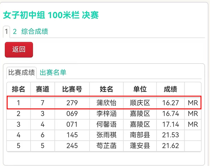 单项破纪录:苟筠皓(跳远)、张涵(跳高)、陈铃鑫(400米)、蒲欣怡(跳远)、蒲欣怡(100米栏)