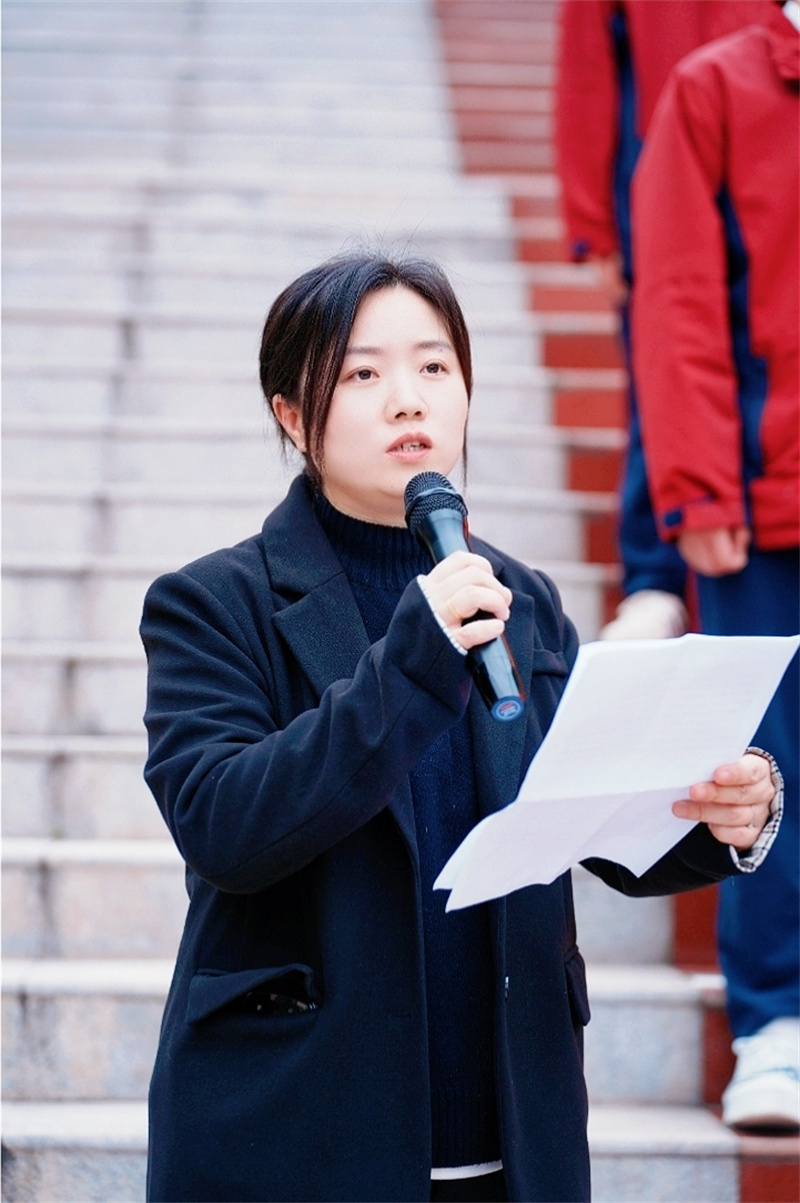 南充一中团委书记文雯致辞,文书记带领大家共同缅怀革命先烈的崇高精神与不朽功绩,寄语全体团员铭记历史、不忘初心、传承红色血脉,把对英雄的崇敬之情化作学习的动力,厚植爱国情怀,锤炼优良品格,以少年之志赴时代之约,努力成长为堪当大任的新时代青年。